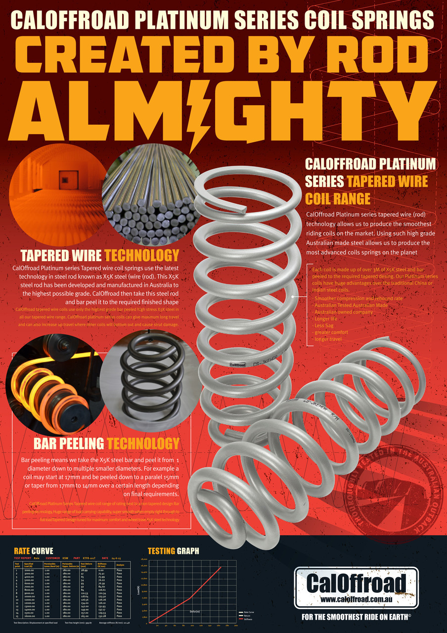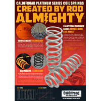 CalOffroad Heavy Duty Platinum Series Rear Coil Springs are designed and manufactured in Australia using high-grade Australian made steel suited specifically to the Ranger Raptor running Fox coilovers. The Fox Coilovers feature internal bypass technology and we have built our coils to work on this Fox platform. Dyno testing has been carried out to ensure the coil rate is tuned to match the shock valving, achieving the smoothest possible ride. These coil springs are a must have for any Raptor running additional weight on the rear, as they will support the extra weight of your truck, as well as maintain its height.